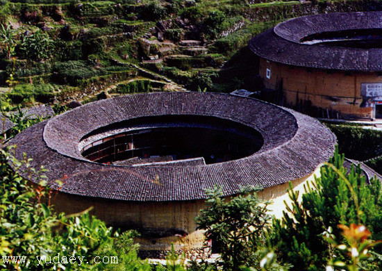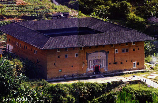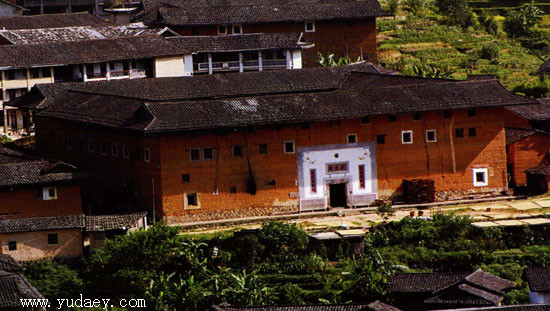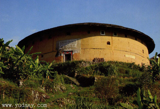 初溪土樓群位於海拔400-500米大山深處的山坡上,群山環(huán)抱,地形複雜,坡度較大,土樓群整體坐南朝北。